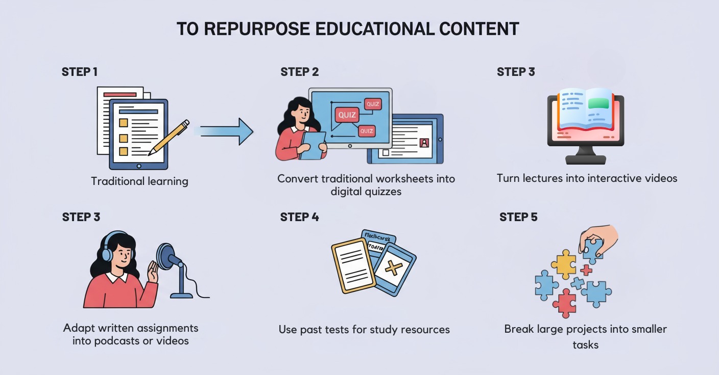 Repurposing can be as simple as converting a worksheet into a digital quiz, turning a lecture into an interactive discussion, or transforming a written assignment into a multimedia project. The key is to tailor the content to fit different learning styles, making it more accessible and engaging for students.