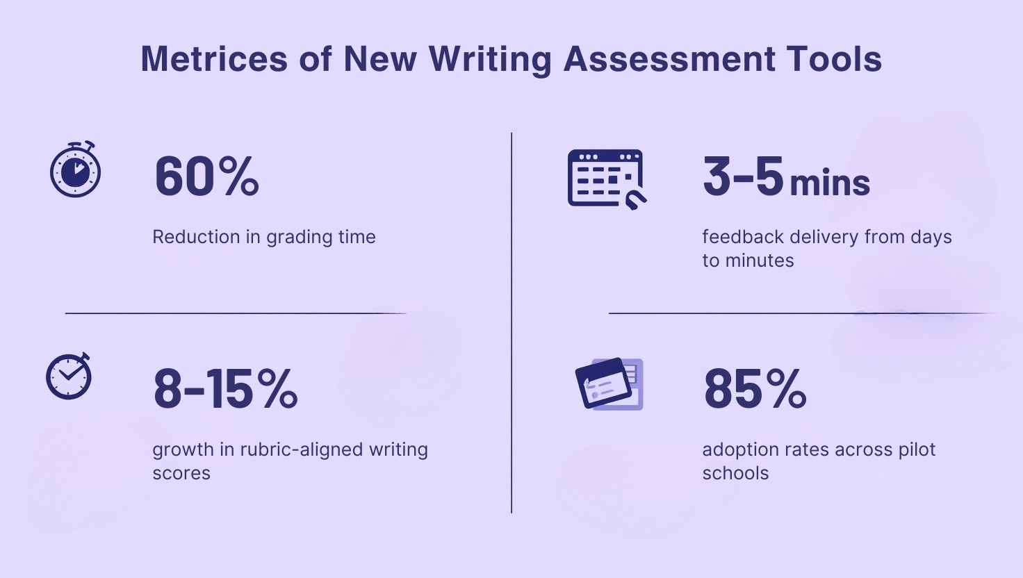 • 8–15% growth in rubric-aligned writing scores within a semester